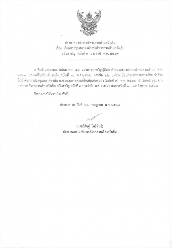 ประกาศ เรื่อง เรียกประชุมสภาองค์การบริหารส่วนตำบลวังเย็น สมัยสามัญ สมัยที่ 3 ประจำปี พ.ศ. 2567