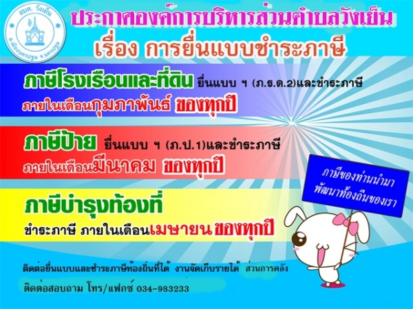 จึงเรียนมาเพื่อโปรดทราบและขอรับแบบแสดงรายการเพื่อชำระภาษีต่างๆ ได้ ณ ห้องส่วนการคลัง องค์การบริหารส่วนตำบลวังเย็น หรือมีข้อสงสัยกรุณาสอบถามได้ที่ โทร/โทรสาร 034-983233