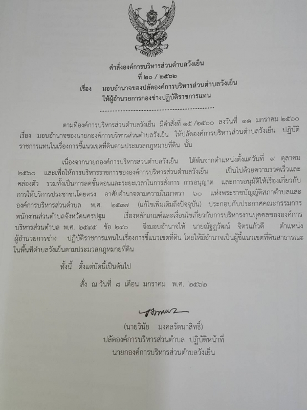คำสั่งองค์การบริหารส่วนตำบลวังเย็นเรื่อง มอบอำนาจของปลัดองค์การบริหารส่วนตำบลวังเย็นให้ผู้อำนวยการกองช่างปฏิบัติราชการแทน