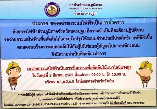 วันที่ 1 มีนาคม 2565 การไฟฟ้าภูมิภาค จังหวัดนครปฐม ฝากประชาสัมพันธ์ของดจ่ายกระแสไฟฟ้าเป็นการชั่วคราว เพื่อตัดต้นไม้แนวไลน์แรงสูง ในวันพุธที่ 2 มิถุนายน 2565 ตั้งแต่เวลา 9.00 น. – 13. 00 น. บริเวณ หมู่ 1 , หมู่ 2 และ หมู่ 5 ตำบลวังเย็น