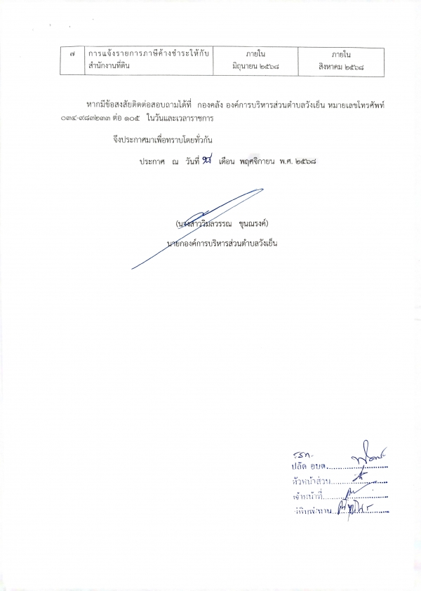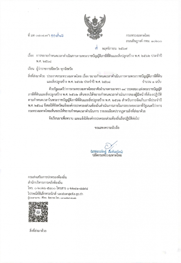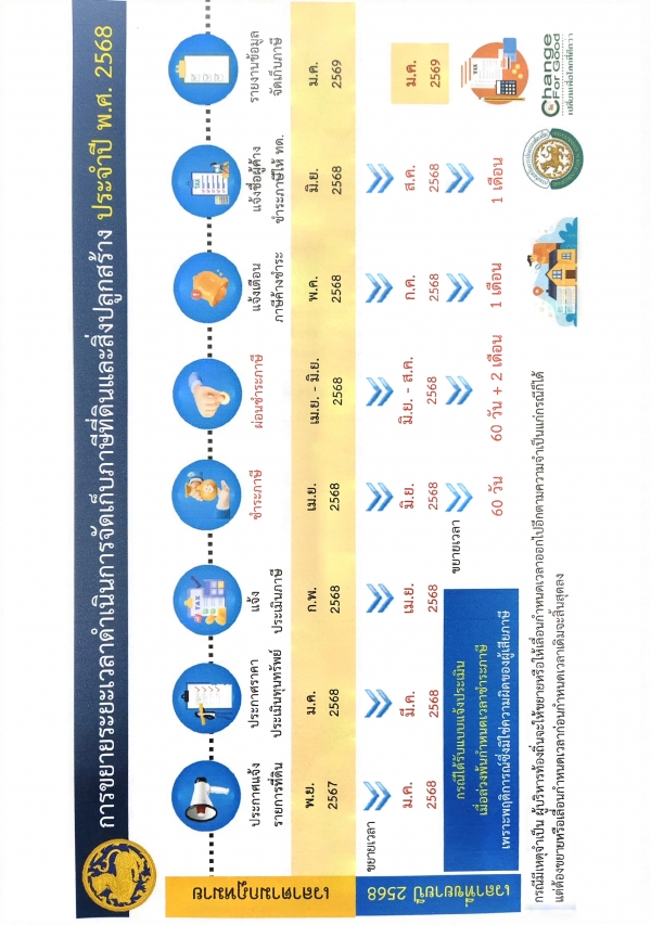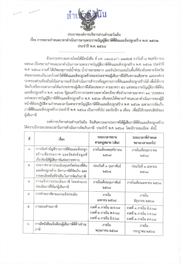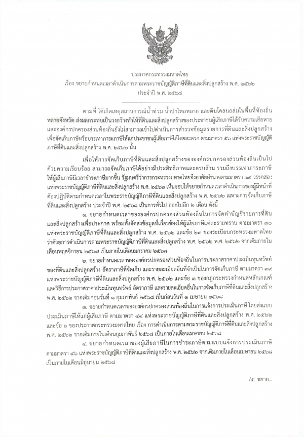 ประกาศ เรื่องการขยายกำหนดเวลาดำเนินการตามพระราชบัญญัติภาษีที่ดินและสิ่งปลูกสร้าง พ.ศ.2562 ประจำปี 2568