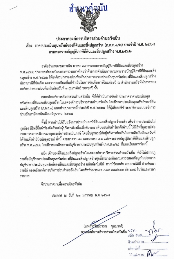 ประกาศ เรื่อง ราคาประเมินทุนทรัพย์ของที่ดินและสิ่งปลูกสร้าง ภ.ด.ส. 1 ประจำปี พ.ศ.2568
